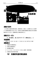 09-12≧ょうセら"く(14)運動の目的広<府民に交通安全思想の普及・浸透を図り、交通ルールの遵守と正しい交通マナーの実践を習慣づけるとともに、府民自らが道路交通環境の改善に向けた取組を推進することにより、交通事故防止の徹底を図ること。運動スローガン『 年の瀬も あつたかマす―で 事故はなし 』実施期間平成21年12月11日(金)~12月31日(木)までの21日間運動重点◇ 高齢者の交通事故防止◇ 夜間の交通事故防止◇ 飲酒運転の根絶◇ シートベルト・チャイルドシートの正しい着用・使用の徹底◇ 自転車の安全な利用の促進W 京都府交通対策協議会