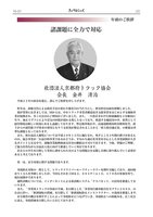 10-01()年年頭頭ののごご挨挨拶拶諸課題に全力で対応社社団団法法人人京京都都府府トトララッックク協協会会会会長長金金井井清清治治平成22年の新春を迎え、謹んでご挨拶を申し上げます。昨年は、政権交代による政治手法の変わり様を目の当たりにし、歴史的な局面を経験しました。我が業界におきましては、国からは、中小トラック事業者構造改善支援事業をはじめとする補助事業が展開され、多くの会員のご利用がございました。また、一旦落着きかけた軽油価格も上昇傾向に有り、加えてデフレにより景気の回復が遅れる兆しとなっており、低迷する輸送量の中、依然として経営環境は厳しい状況にあると認識しております。暫定税率廃止や、高速道路利用料金無料化等、荷主からの運賃値下げ要求の要因となりうる状況が想定されることから「荷主取引適正化」の推進は重要な課題となっております。また、新公益法人制度については平成20年12月に施行され、残すところ4年間の猶予があるものの、協会事業が「公益目的事業であるかどうか」すなわち適正化事業を中心とした事業展開が大きなポイントとなる中で、運輸事業振興助成交付金の継続は不可欠であります。今後、皆様のご理解、ご協力を得ながら公益法人化に向けて推進していく所存であります。社会との共生を目指して業界に課せられた次のような問題点を克服し真剣に取り組んでいく必要があると考えております。第一は、安全対策に関する問題であります。事故防止対策の一環として、トラックドライバーセーフティーラリーを例年実施しており、前回初めて1万人を突破しましたが、今回もそれを上回る2,094チーム10,470名の参加を得て、現在展開中であります。適性診断については、インターネットによる新診断システム「ナスバネット」の活用を推進してまいります。また、「事業用トラックの事故の半減」を目標とした「事業用自動車総合安全プラン2009」の公表に伴い、「飲酒運転の撲滅」を目指して「飲酒運転防止インストラクター」の養成を推進します。安全教育の機会を増やすことによって事故防止につなげていき、事故防止への取組みを、広く社会に訴え、事故撲滅を目指したいと存じております。