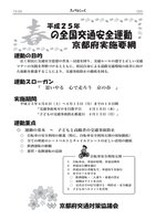 13-03(20)広く府民に交通安全思想の普及・浸透を図り、交通ルールの遵守と正しい交通マナーの実践を習慣づけるとともに、府民自身による道路交通環境の改善に向けた取組を推進することにより、交通事故防止の徹底を図る。『思いやる心で走ろう京の春』平成25年4月6日(土)~4月15日(月)までの10日間『交通事故死ゼロを目指す日4月10日(水)』『子どもの交通事故防止推進日4月15日(月)』運動の基本~子どもと高齢者の交通事故防止◇自転車の安全利用の推進(特に、自転車安全利用五則の周知徹底)◇全ての座席のシートベルトとチャイルドシートの正しい着用の徹底◇飲酒運転の根絶◇悪質・危険運転の追放自転車安全利用五則1自転車は、車道が原則、歩道は例外2車道は左側を通行3歩道は歩行者優先で、車道寄りを徐行4安全ルールを守る○飲酒運転・二人乗り・並進の禁止○夜間はライトを点灯○交差点での信号遵守と一時停止・安全確認5子どもはヘルメットを着用